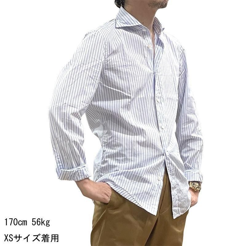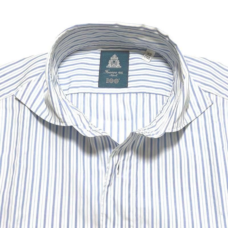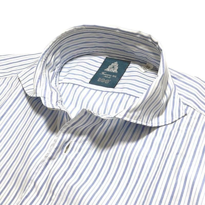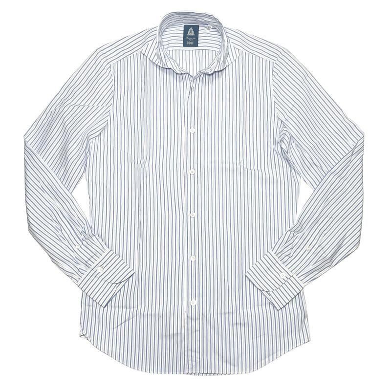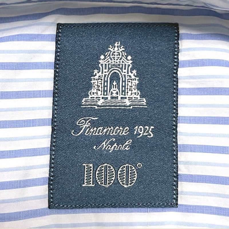 アームホール、ボタン、裾のガゼットをそれぞれ手縫いで仕立てたオルタネートストライプ柄のブロードシャツ。台襟の高さ3.5cmのカッタウェイカラー「SIMONE-シモーネ-」は、襟のロール感や開き具合が絶妙なフィナモレの代名詞とも言える襟型です。夏は1枚で、春・秋・冬はインナーとして、オールシーズン活躍します。ホワイトをベースに大小2種類のブルーのストライプが映える、ビジネスシーンでもカジュアルシーンでも着用可能なオン・オフ兼用モデル。XS / S / M / L の4サイズ展開です。創業100周年を記念した織りネームや下げ札が付属する限定モデル。